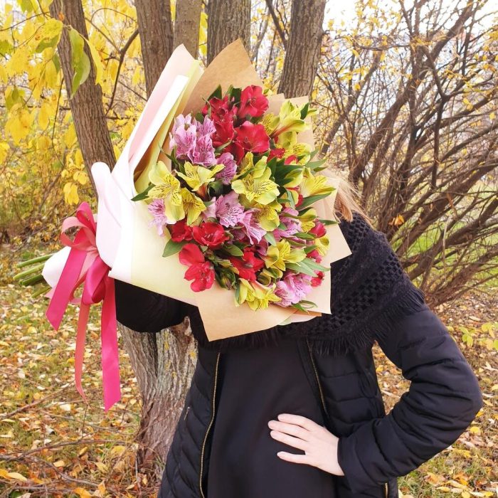 Лента атласная – 2 шт.Упаковка дизайнерская – 3 шт.Открыточка с вашими пожеланиями – 1 шт.Альстромерия Микс Европа – 15 шт.любовь флориста (бесплатно) – 1 шт.