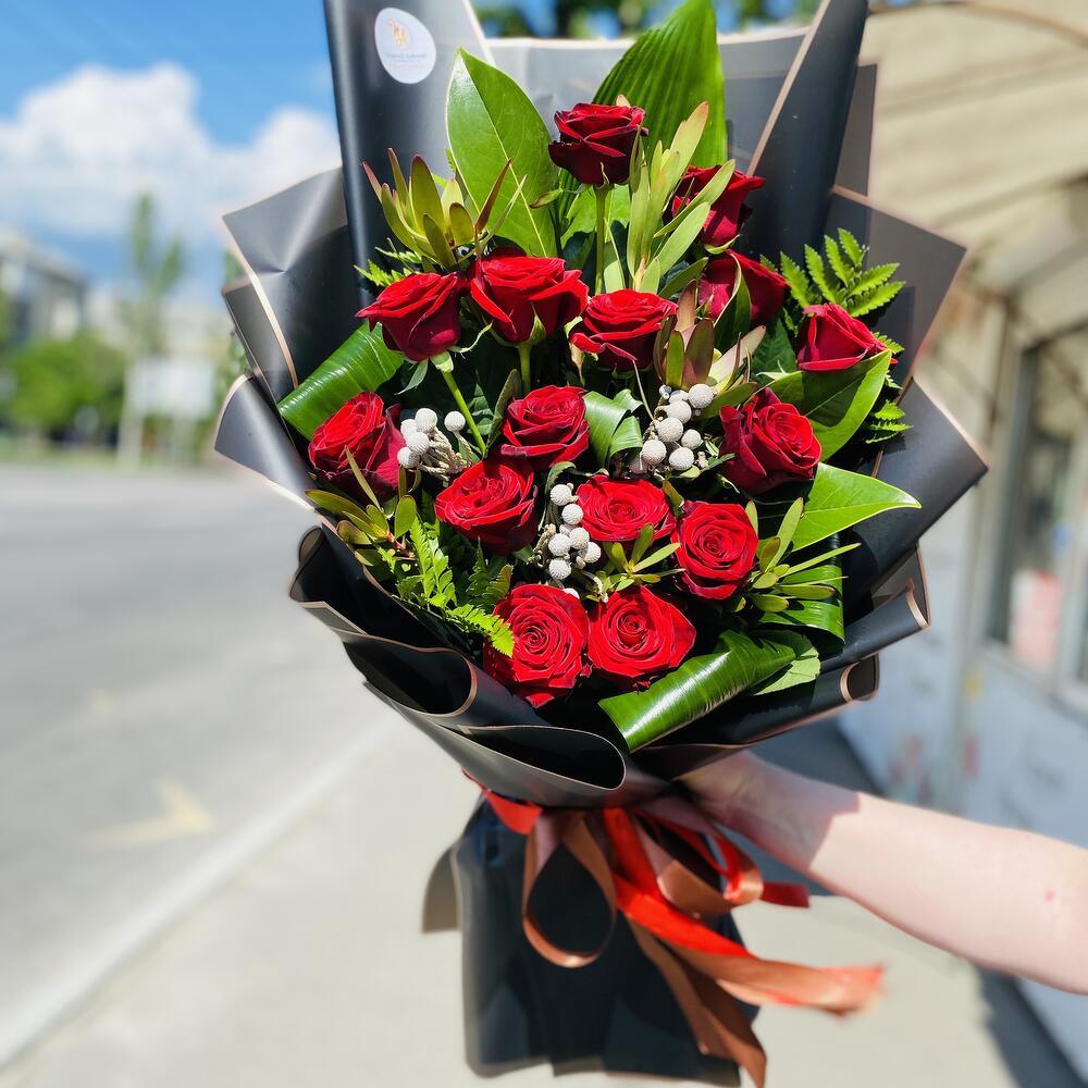 троянда висока червона – 17 шт. брунія – 3 шт. леукадетрон – 3 шт. арахніодіс – 3 шт. фісташка – 3 шт. аспідістра – 7 шт. оформлення букета – 1 шт.