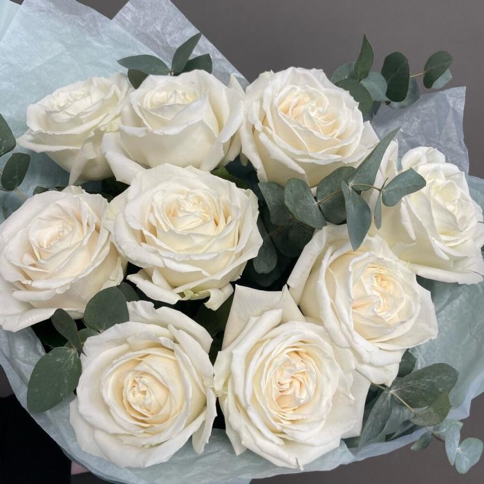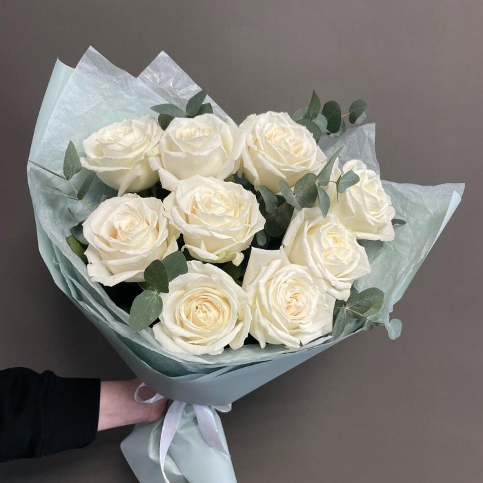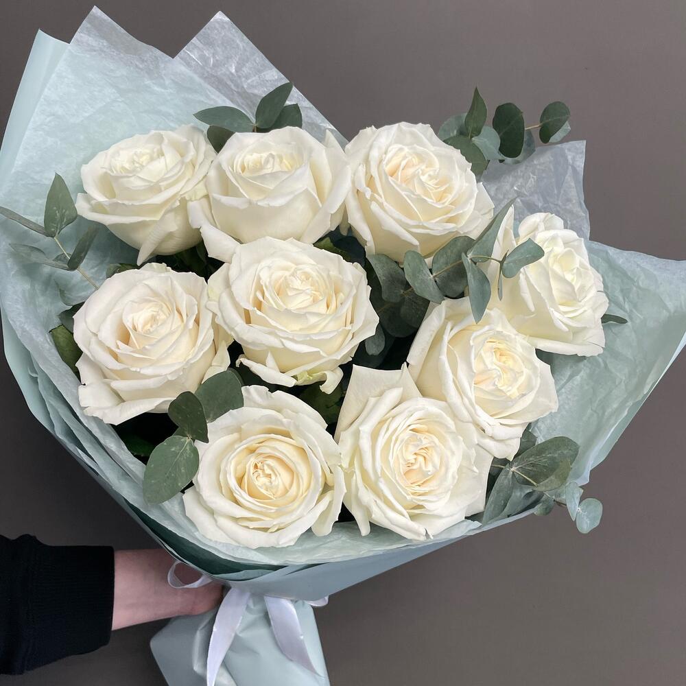 Эвкалипт – 3 шт.Лента атласная – 2 шт.Упаковка дизайнерская – 2 шт.белые пионовидные розы – 9 шт.