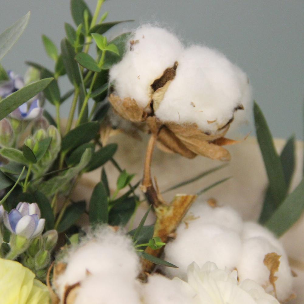 Ранункулюс – 6 шт.Маттиола – 5 шт.Твидия – 4 шт.Хлопок – 3 шт.Амарант – 2 шт.Краспедия – 2 шт.Эвкалипт – 7 шт.Упаковка – 3 шт.Лента атласная – 1 шт.
