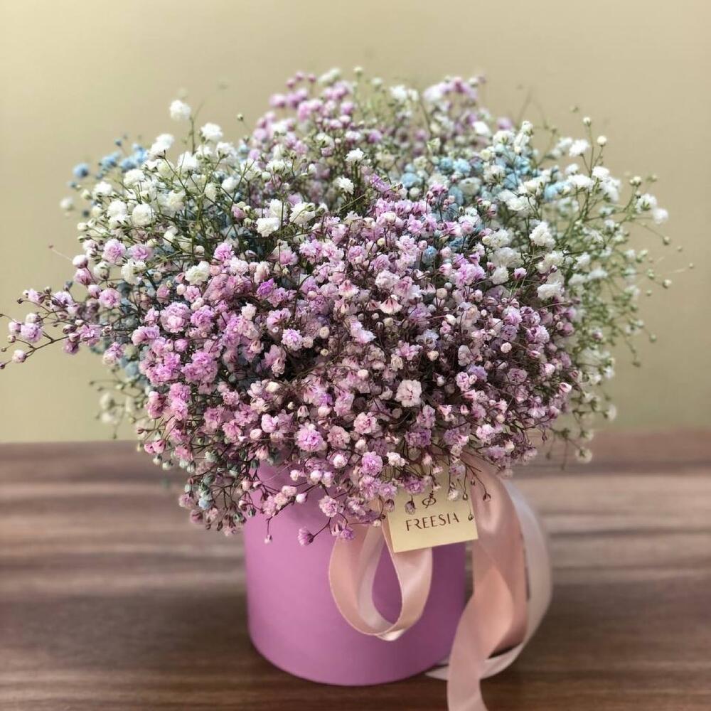 “Сиреневый туман” – композиция из гипсофилы в шляпной коробке