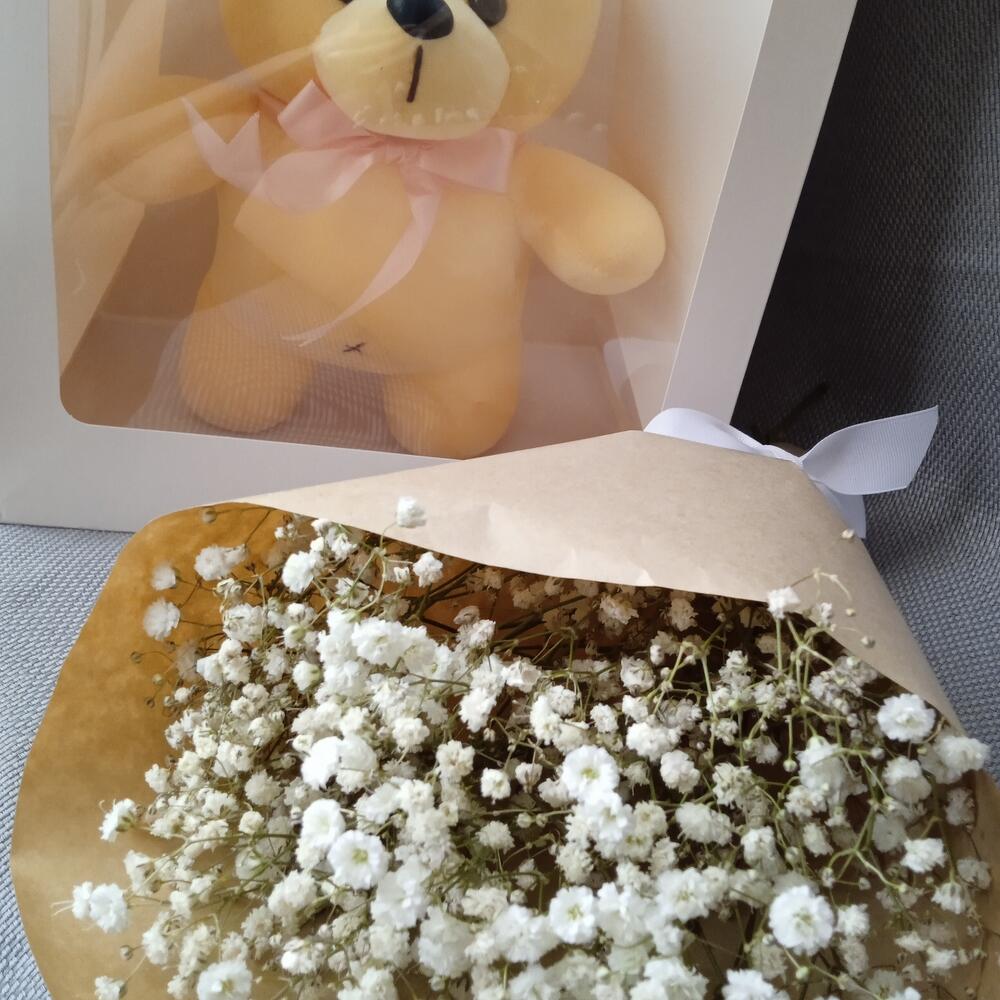 Мишка плюшевый – 1 шт.Гипсофила – 3 шт.Крафт упаковка – 1 шт.Лента – 1 шт.Пакет подарочный – 1 шт.