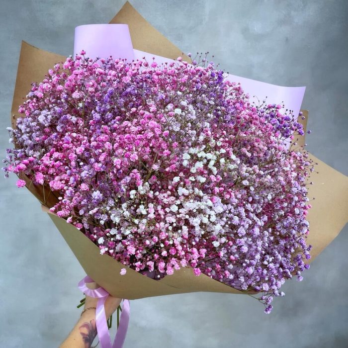 Охапка разноцветной гипсофилы – белой, розовой, фиолетовой – в стильном крафте. Подойдёт в подарок маме, жене, девушке, коллеге. Произведет яркое впечатление!