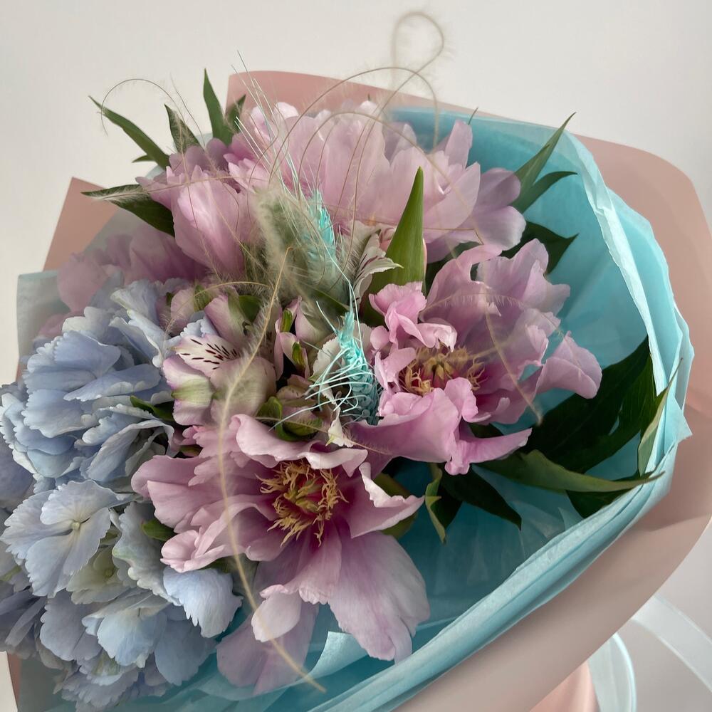 Альстромерия – 1 шт.Гортензия – 1 шт.Пион – 5 шт.Пленка – 6 шт.Колоски пшеницы – 2 шт.Стифа – 2 шт.