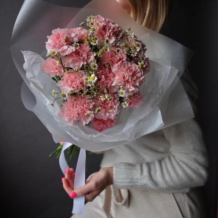 Лента атласная – 1 шт.Диантус – 15 шт.Матрикария – 5 шт.Упаковка дизайнерская – 1 шт.Открыточка с вашими пожеланиями – 1 шт.