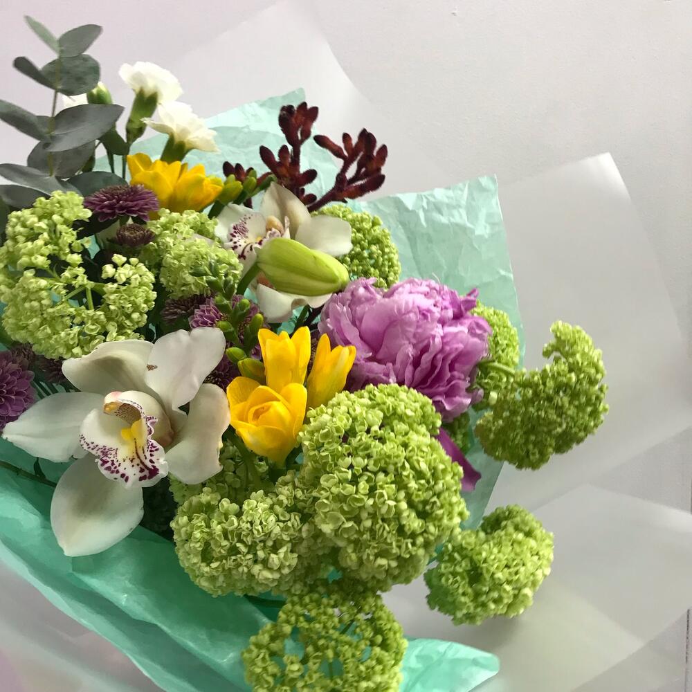 Пион – 1 шт.Орхидея Цимбидиум – 2 шт.Вибурнум – 3 шт.Гвоздика кустовая – 1 шт.Сантини – 2 шт.Фрезия – 2 шт.Анигозантус – 1 шт.Эвкалипт цинерея – 1 шт.Лента атласная – 1 шт.Упаковка дизайнерская – 1 шт.Открыточка с вашими пожеланиями – 1 шт.