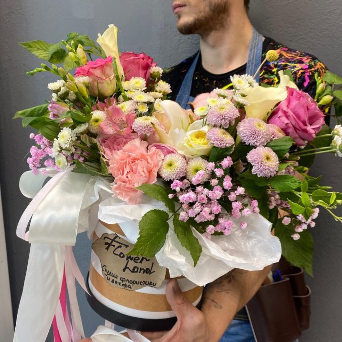 Альстромерия – 2 шт.Гипсофила – 1 шт.Хлопок – 2 шт.Зелень – 5 шт.Диантус – 1 шт.Сантини – 5 шт.каалы – 4 шт.розы микс – 6 шт.