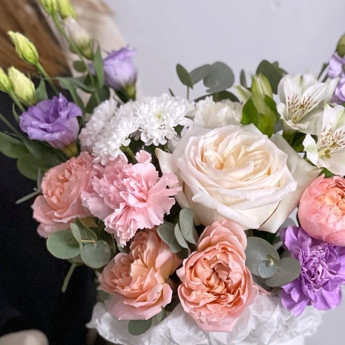 кустовые пионовидные розы – 2 шт.Лизиантус – 1 шт.Маттиола – 1 шт.Пионовидная роза – 1 шт.Альстромерия – 1 шт.Гвоздика – 3 шт.Сантини – 1 шт.шляпная коробка с надписью – 1 шт.