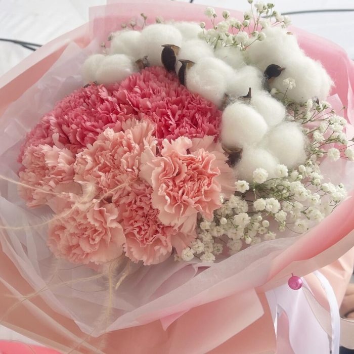 Гипсофила – 1 шт.Лента атласная – 2 шт.Тишью – 6 шт.Пленка матовая – 4 шт.Хлопок натуральный – 5 шт.Стифа – 5 шт.диантус розовый (гвоздика ) – 9 шт.
