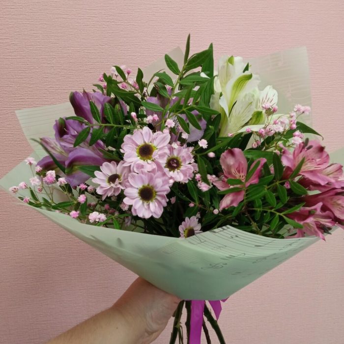 Альстромерия – 3 шт.Хризантема Сантини – 4 шт.Упаковка – 1 шт.Лента атласная – 1 шт.зелень декоративная – 2 шт.гипсофила радужная – 1 шт.