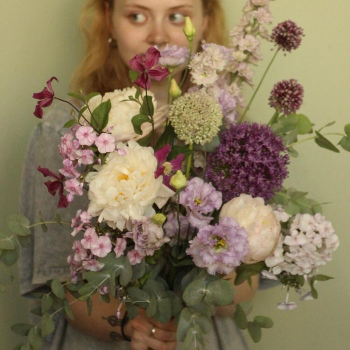 Лавандовый раф – Букет с пионами и луком