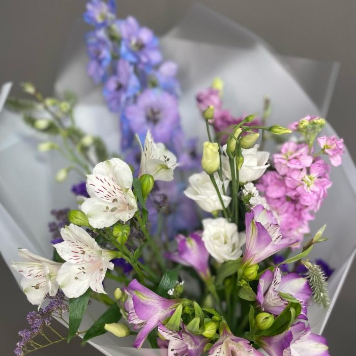 Альстромерия – 3 шт.Верба – 1 шт.Дельфиниум – 1 шт.Лизиантус – 2 шт.Маттиола – 1 шт.Статица – 2 шт.Эустома – 3 шт.Лента атласная – 1 шт.Упаковка дизайнерская – 1 шт.