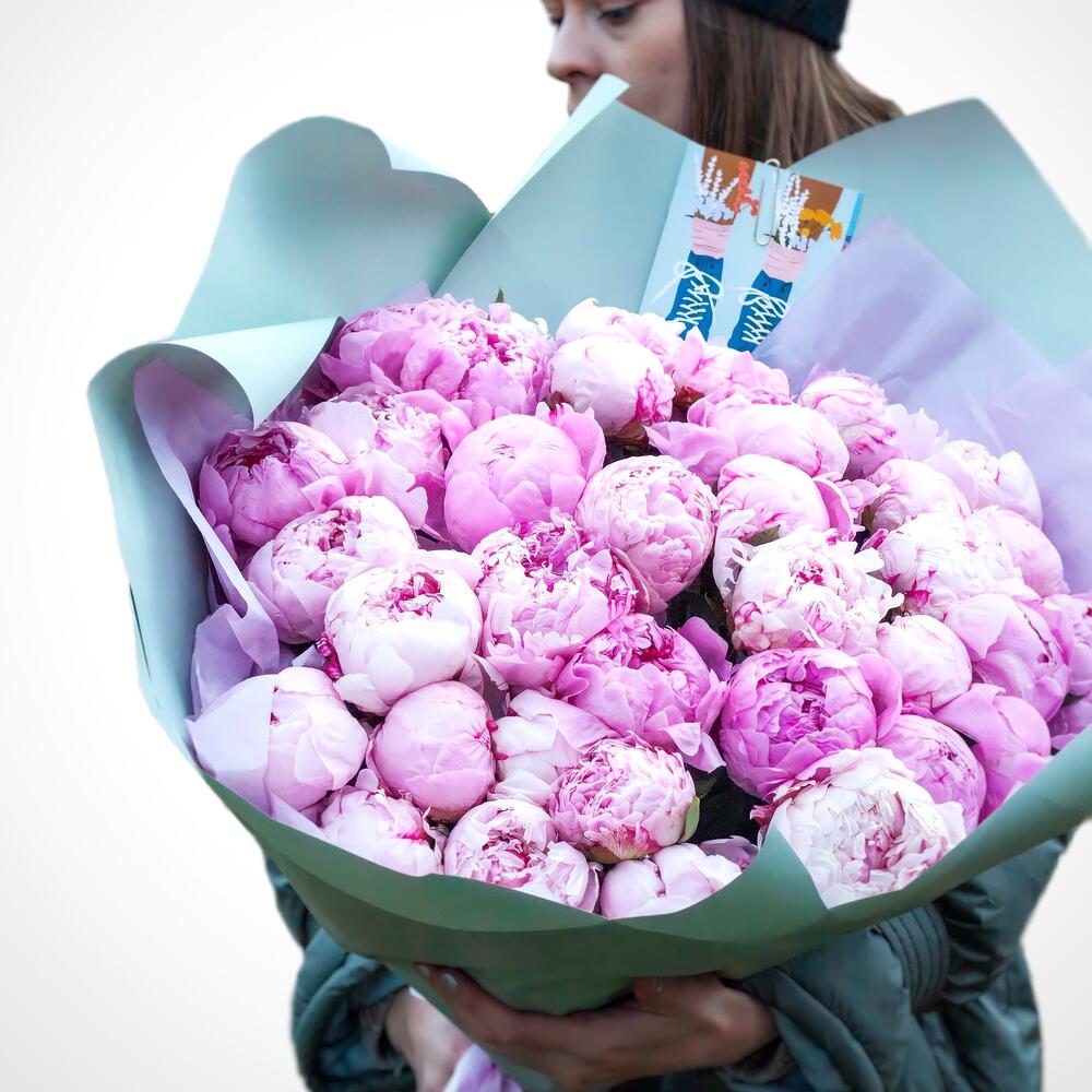 Лента атласная – 4 шт.Тишью – 4 шт.Упаковка дизайнерская – 1 шт.Пион розовый – 41 шт.Средство для продления жизни цветов – 2 шт.инструкция по уходу за цветами – 1 шт.