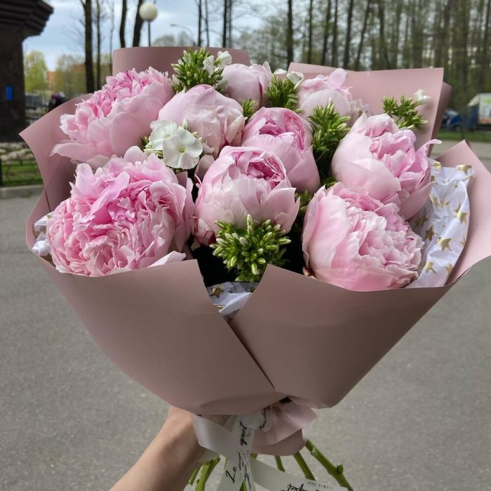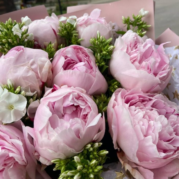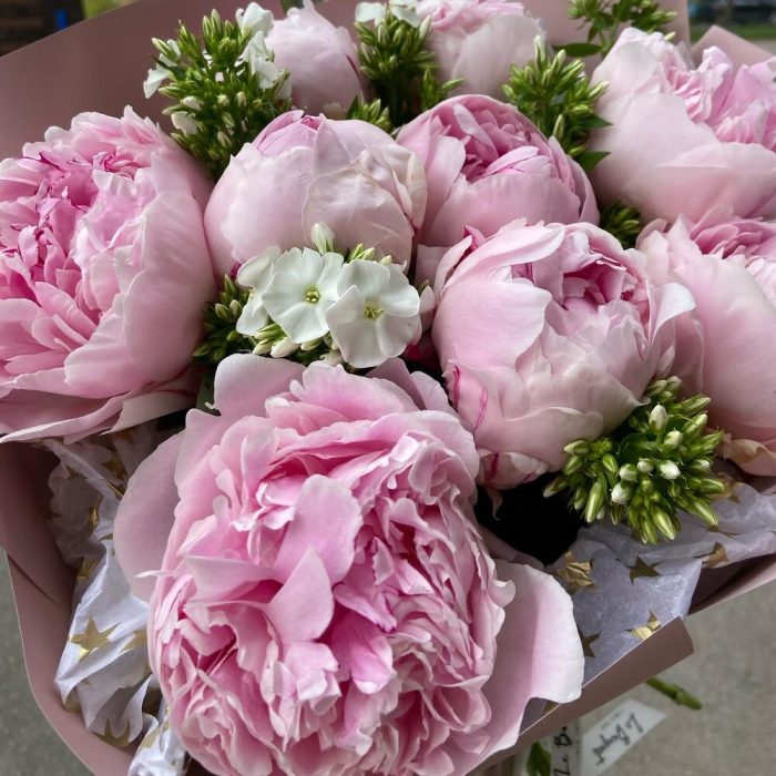 Пион Сара Бернар – 9 шт.Упаковка дизайнерская – 5 шт.Флокс белый – 6 шт.