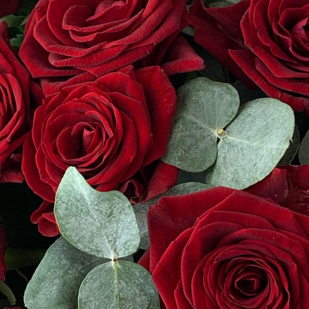 Букет 15 ароматных красных роз с эвкалиптом