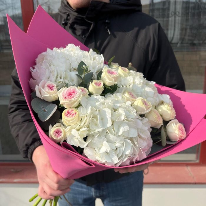 Букет гортензий с пионовидными розами и эвкалиптом