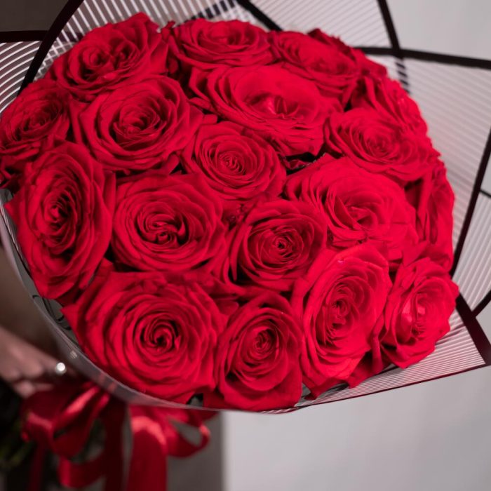 Лента атласная – 2 шт.Красная роза – 19 шт.Дизайнерская упаковка – 2 шт.подкормка для срезанных цветов – 1 шт.инструкция по уходу за цветами – 1 шт.любовь флориста (бесплатно) – 1 шт.