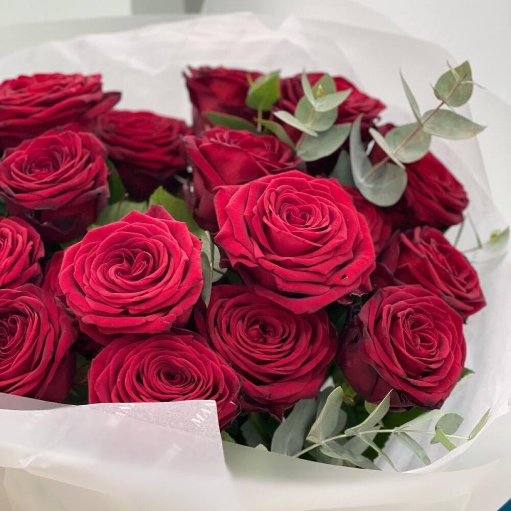 Букет из 21 шт. высоких красных роз с эвкалиптом