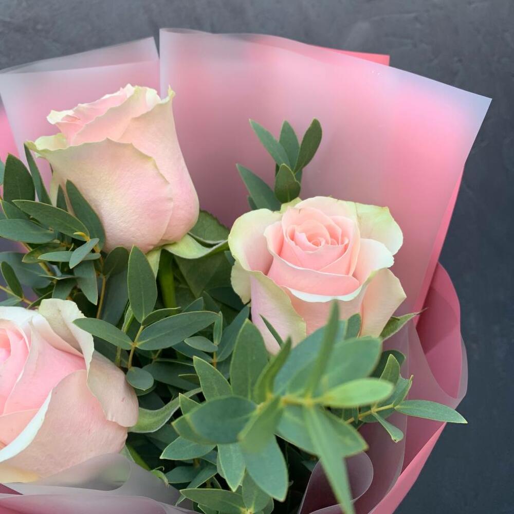 Букет из 3 розовых роз и зелени «Токио»
