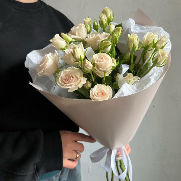 Роза кустовая – 5 шт.Лента атласная – 2 шт.Упаковка дизайнерская – 2 шт.
