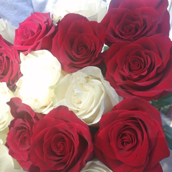 Букет из красных и белых роз под ленту