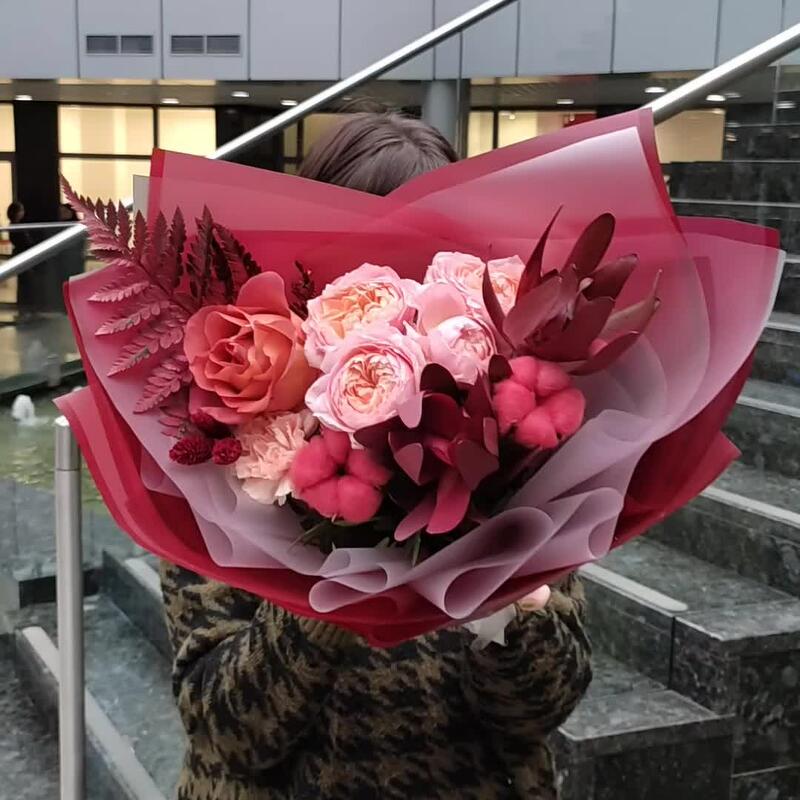 Роза кустовая пионовидная – 1 шт.Роза – 1 шт.леукондендрон – 2 шт.Хлопок – 2 шт.Гвоздика – 1 шт.Фаларис – 3 шт.Папоротник – 1 шт.Лента – 2 шт.Упаковка дизайнерская – 2 шт.