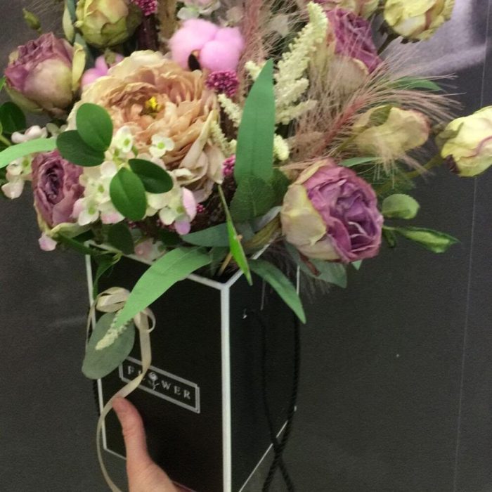 Пионовидная роза – 3 шт.Сухоцветы – 6 шт.хлопок искусственный окрашенный – 2 шт.