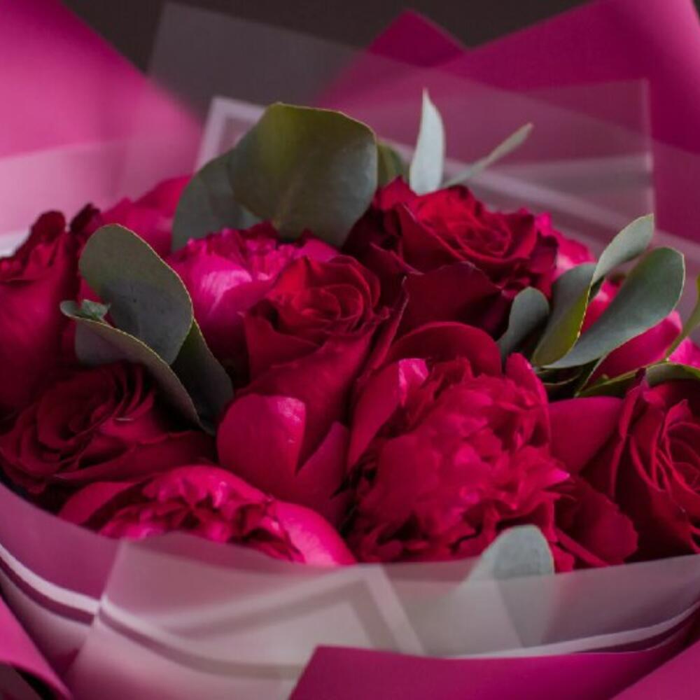 Атласная лента – 2 шт.Корейская пленка – 2 шт.пион red sharm – 5 шт.эвкалипт cinerea – 4 шт.кенийская красная роза 50 см – 6 шт.