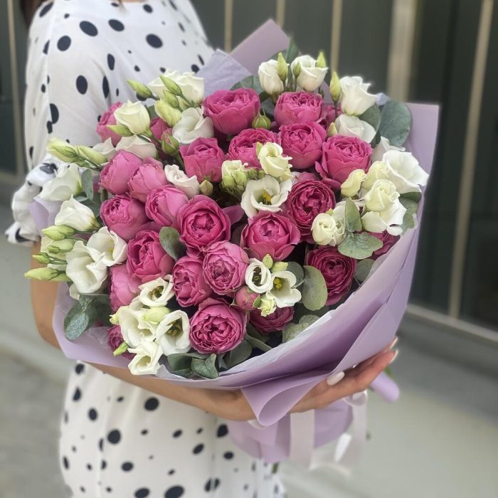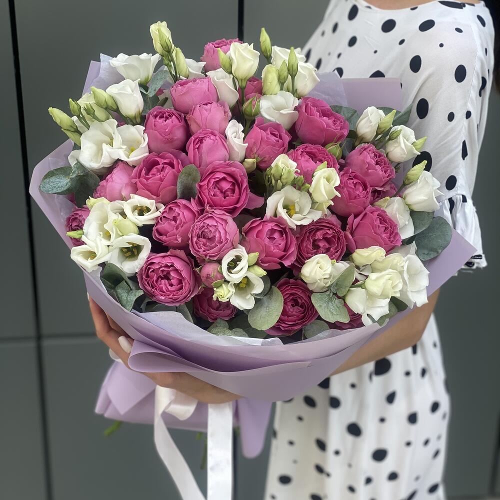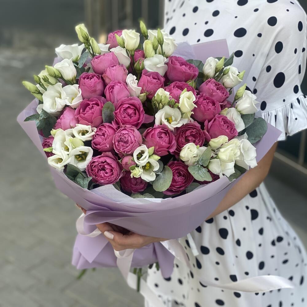 Букет из кустовых пионовидных роз, белой классической эустомы и эвкалипта в оформлении!