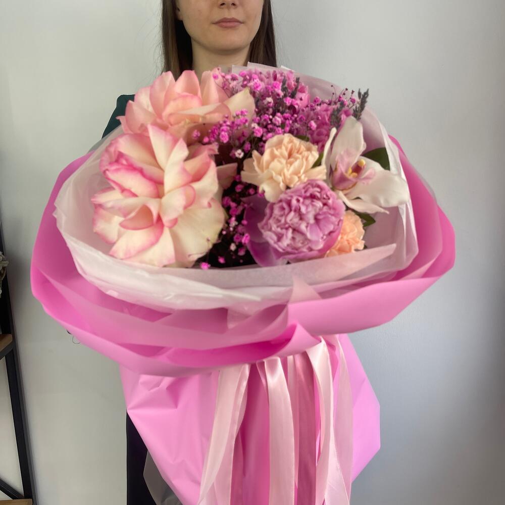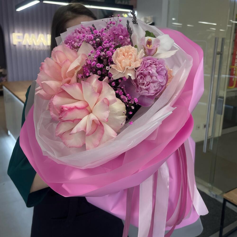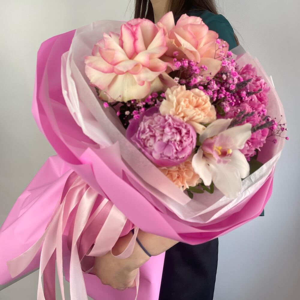 Гипсофила – 1 шт.Лаванда (сухоцвет) – 10 шт.Орхидея Цимбидиум – 1 шт.Пион – 3 шт.Диантус – 2 шт.Салал листья – 4 шт.Роза французская – 2 шт.