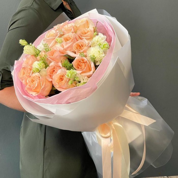 Букет с розами и лизиантумом