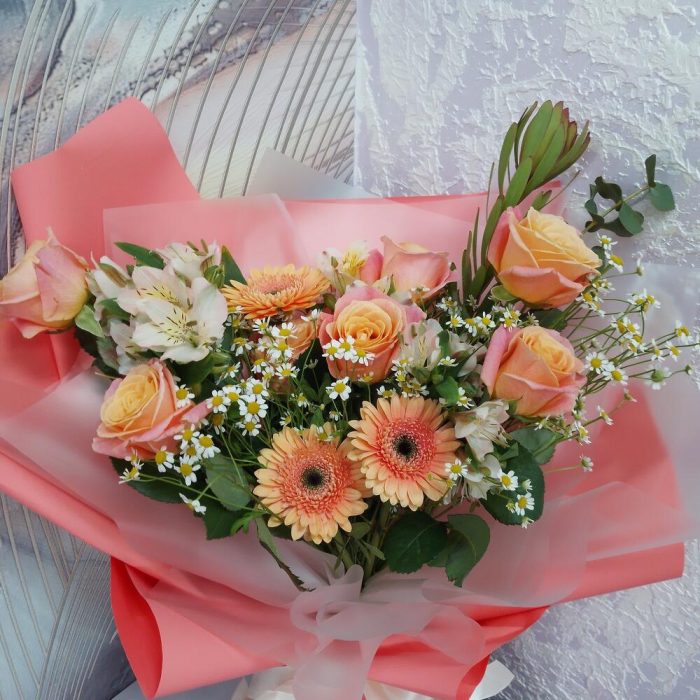 Матрикария – 6 шт.Сафари бордовая – 1 шт.Эвкалипт – 1 шт.фисташка зелень – 1 шт.Роза подмосковная 60 см – 7 шт.Гермини – 3 шт.Упаковка дизайнерская – 2 шт.Лента атласная – 1 шт.Альстромерия – 3 шт.