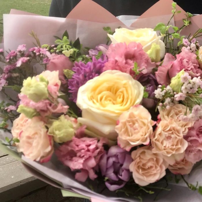 Роза Эквадор – 3 шт.Кустовая роза – 3 шт.Лизиантус – 3 шт.Тюльпан пионовидный – 4 шт.Гиацинт – 1 шт.Ваксфлауэр – 2 шт.зелень декоративная – 3 шт.Упаковка дизайнерская – 5 шт.Лента атласная – 2 шт.