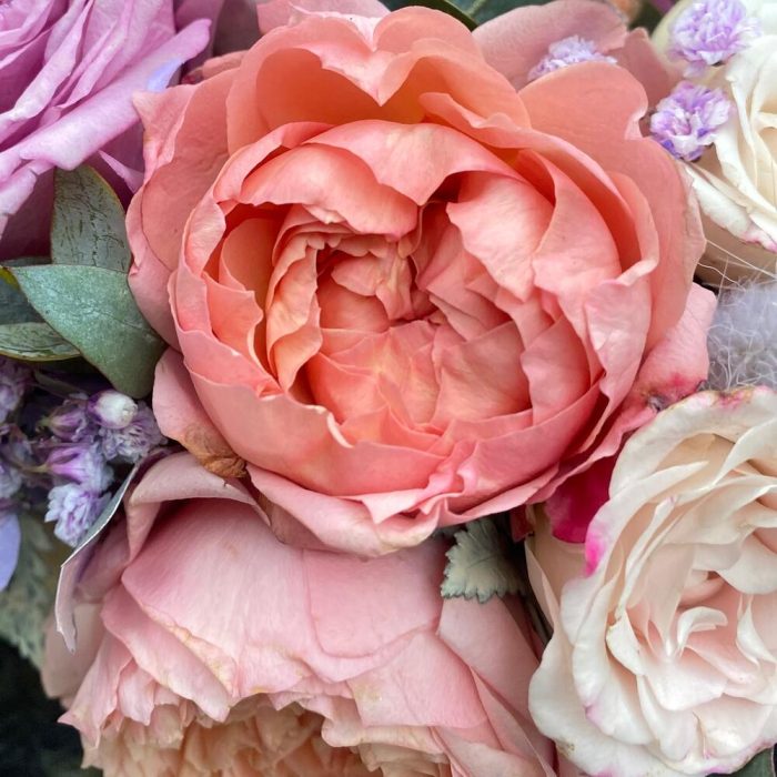 Роза – 1 шт.Роза кустовая – 1 шт.Роза кустовая джульетта – 1 шт.Маттиола – 1 шт.Гвоздика – 2 шт.Эустома – 1 шт.Оазис – 1 шт.Ящик – 1 шт.