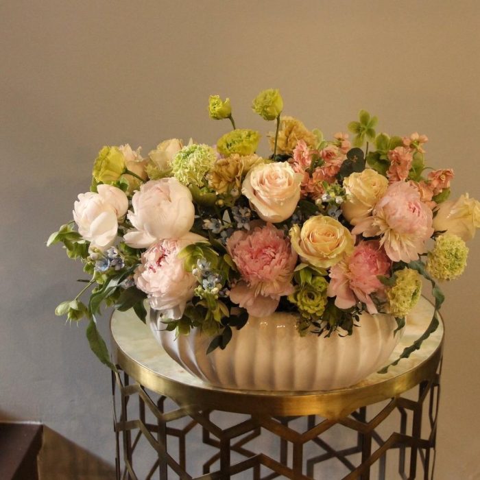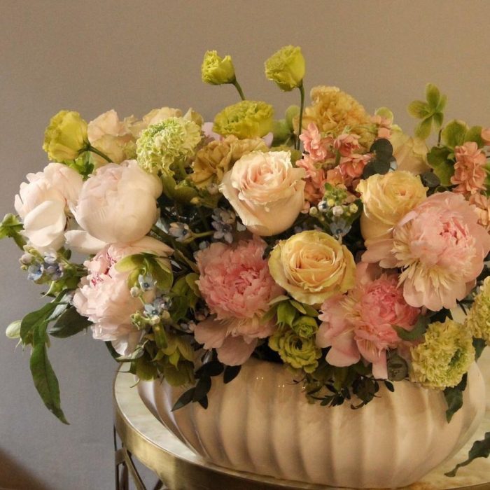 Пион – 9 шт.Твидия – 6 шт.Лизиантус – 3 шт.Маттиола – 3 шт.Роза – 7 шт.Эвкалипт – 4 шт.флебодиум – 3 шт.Ваза керамика – 1 шт.Оазис флористический – 1 шт.