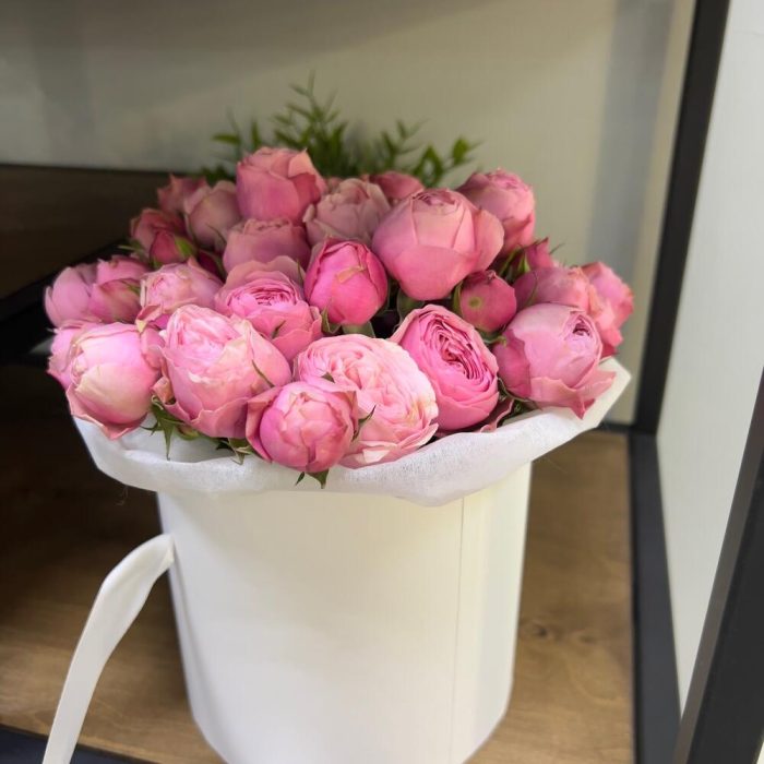 Пионовидная роза кустовая – 11 шт.Шляпная коробка – 1 шт.Аквапак – 1 шт.Тишью – 1 шт.