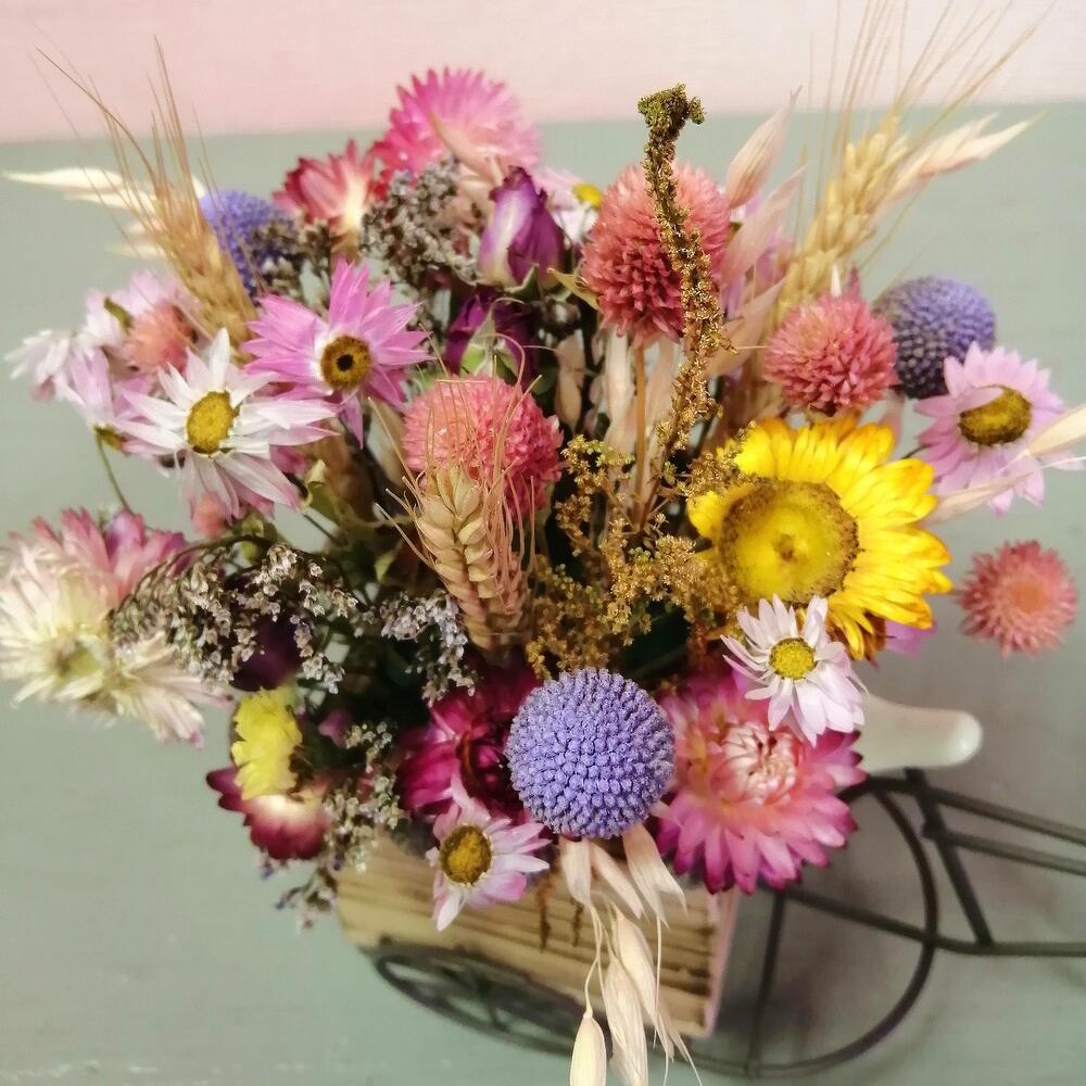 гелихризум (сухоцвет) – 15 шт.Краспедия – 3 шт.Пшеница – 3 шт.Роза кустовая сухоцвет – 1 шт.овес сухоцвет – 1 шт.клевер сухоцвет – 1 шт.Оазис флористический – 1 шт.велосипед декоративный – 1 шт.
