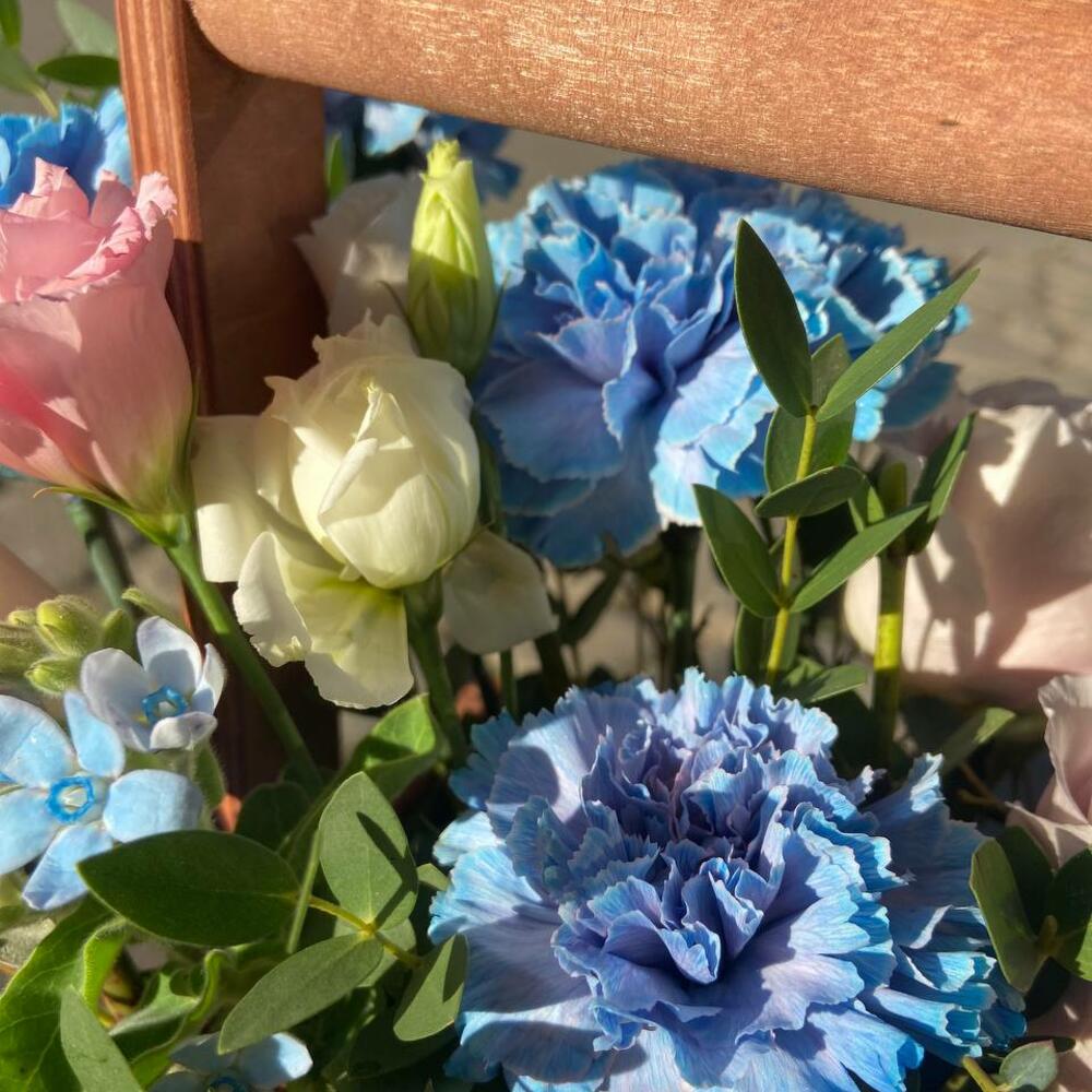 Дельфиниум – 1 шт.Лизиантус – 2 шт.Эвкалипт – 1 шт.Роза Эквадор – 6 шт.Оксипеталум – 2 шт.Ящик деревянный – 1 шт.Оазис флористический – 1 шт.Хавортия – 1 шт.Диантус сортовой – 6 шт.