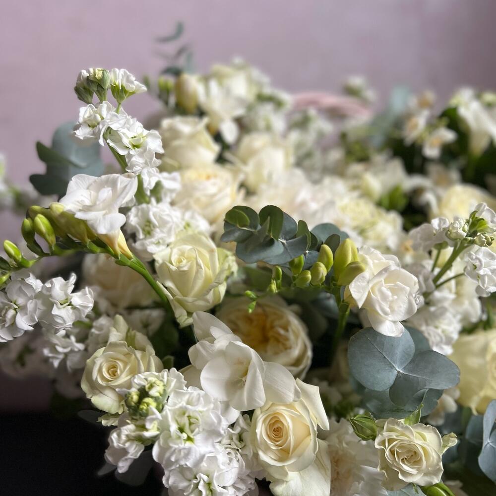Роза – 21 шт.Пион – 1 шт.Роза пионовидная – 7 шт.Фрезия – 28 шт.Маттиола – 35 шт.Гвоздика – 15 шт.Эвкалипт – 13 шт.Корзина плетеная – 1 шт.Флористическая губка – 3 шт.