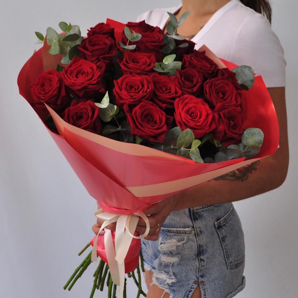 Красные розы с эвкалиптом, 19 штучек