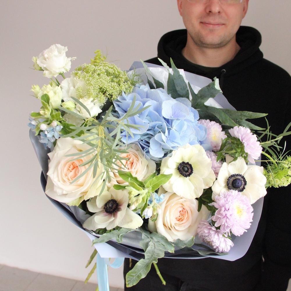 Гортензия – 1 шт.Анемон – 3 шт.Роза пионовидная – 3 шт.Твидия – 2 шт.Астра – 3 шт.Амми – 2 шт.Лизиантус – 2 шт.флебодиум – 2 шт.Эвкалипт – 3 шт.Упаковка – 2 шт.Лента атласная – 1 шт.