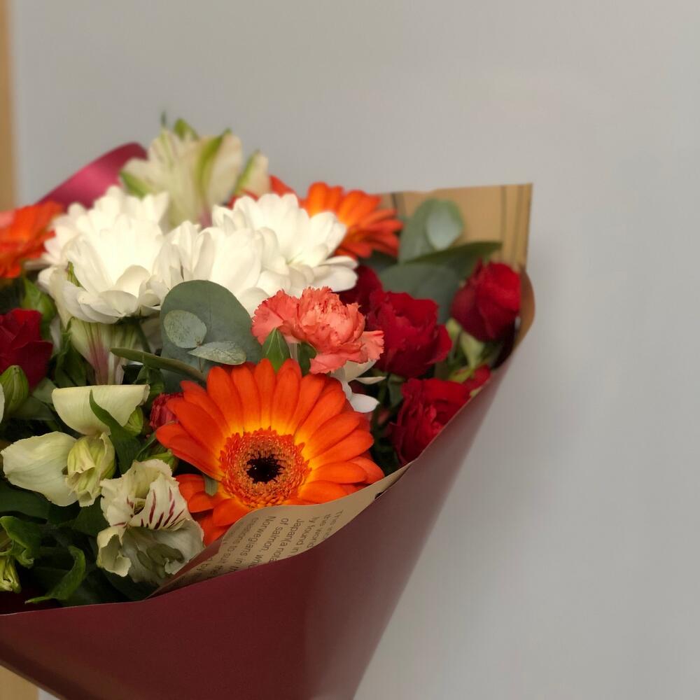 Хризантема кустовая – 1 шт.Гермини – 3 шт.Альстромерия – 2 шт.Роза кустовая – 2 шт.Гвоздика кустовая – 2 шт.Эвкалипт – 1 шт.Авторская упаковка – 1 шт.Лента атласная – 1 шт.