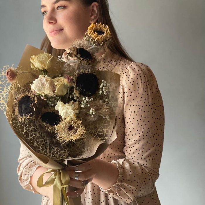 Подсолнух – 5 шт.Роза – 5 шт.Гербера – 3 шт.камыш декоративный – 3 шт.Пленка дизайнерская – 2 шт.Органза – 1 шт.Лента атласная – 1 шт.