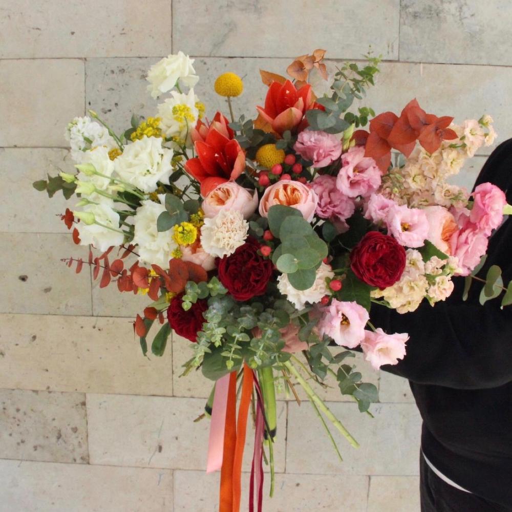 Авторский букет с амариллисами, пионовидными розами, краспедией, хиперикумом, лизиантусом и эвкалиптом.Стильное цветочное решение для любого случая