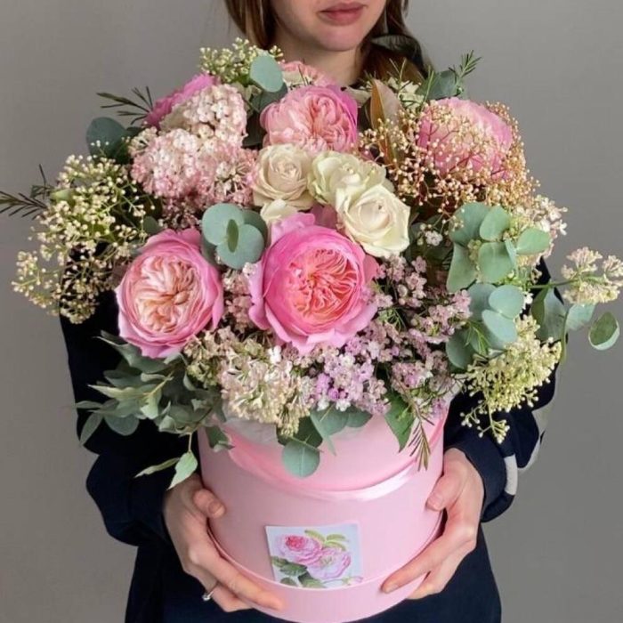 Роза пионовидная – 7 шт.Роза кустовая пионовидная – 3 шт.Сирень – 3 шт.фотиния – 2 шт.Ваксфлауэр – 2 шт.Эвкалипт – 6 шт.Оазис флористический – 2 шт.Шляпная коробка – 1 шт.
