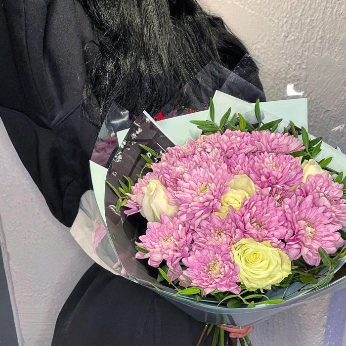 Хризантема кустовая – 4 шт.Роза Эквадор – 5 шт.фисташка зелень – 4 шт.Упаковка дизайнерская – 2 шт.