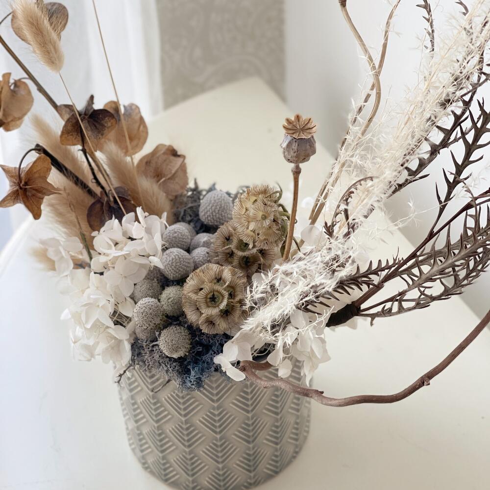 Скабиоза стелата – 3 шт.Лагурус (сухоцвет) – 10 шт.Фритиллярия – 1 шт.Ковыль – 1 шт.Бруния сильвер – 1 шт.гортензия стабилизированная – 1 шт.Мох стабилизированный – 1 шт.сухоцветы микс – 2 шт.Кашпо керамическое – 1 шт.Оазис флористический – 1 шт.